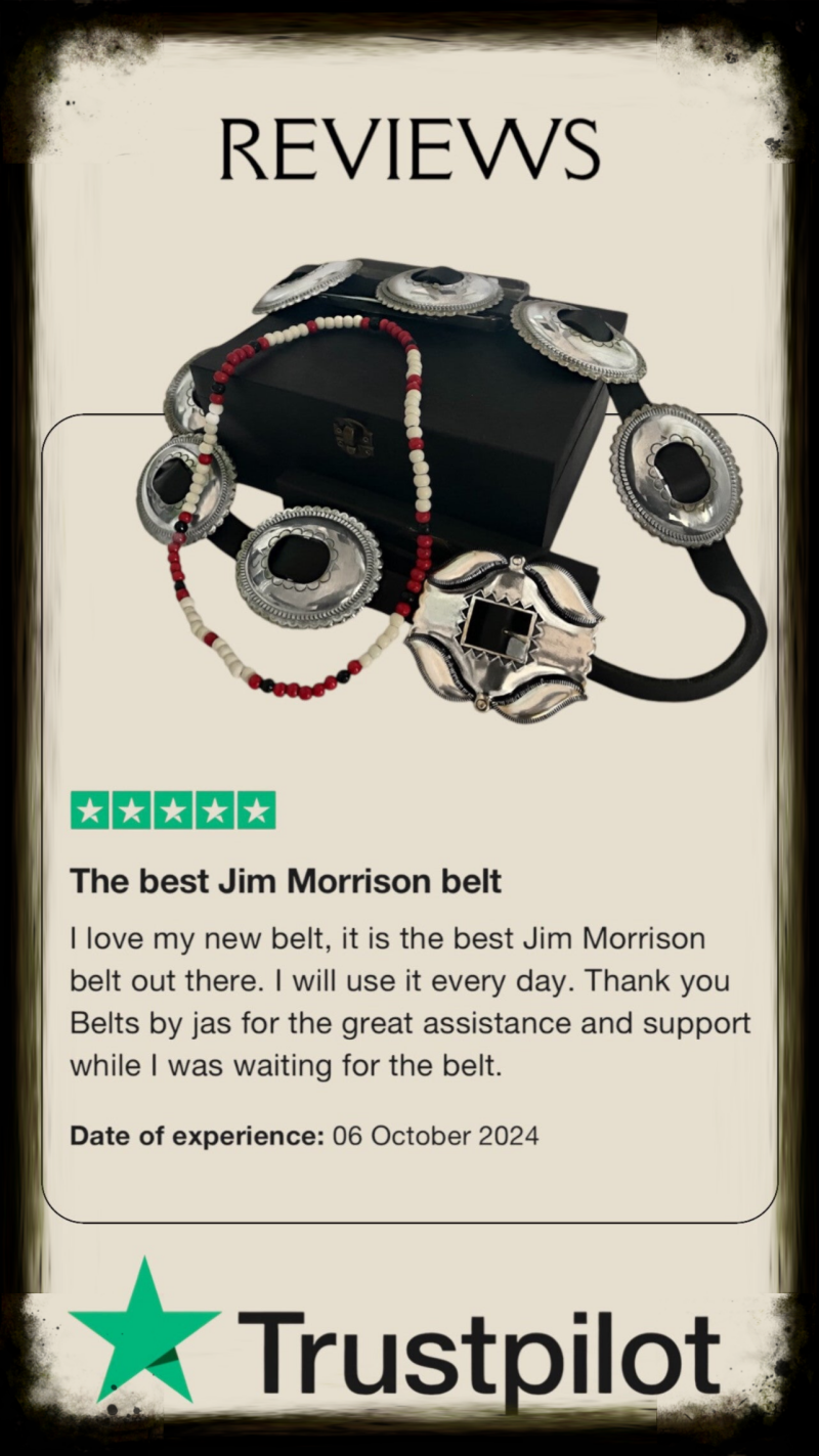 I love the belt, it is the best Jim Morrison belt. I will use it every day. Thank you much for the great assistance and support while I was waiting for the belt.