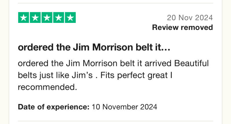Just received my Jim Morrison belt and oh my God this belt is amazing craftsmanship in the leather work is fantastic. This is the best jim belt I have seen and would I recommend? Thank you very much. Break gone through