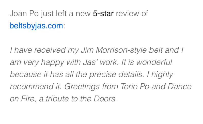 My God, I have just received my Jim Morrison belt. This is epic. Feels great, and the workmanship is out of this world. I am so glad I have one # number 22 thanks jas