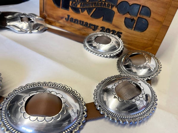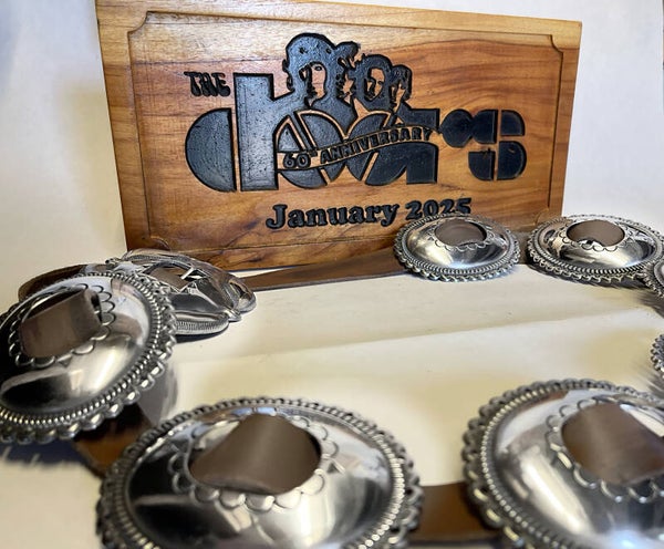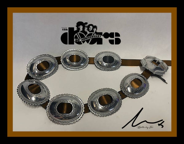 this is a one of one 60th anniversary Jim Morrison belt the leather is a brown tan same as the leather pants, Jim worn at the Hollywood ball this will be number one also comes with a 60th anniversary certificateJim Morrison purchased a 'concho belt' from Joe H. Quintana, was the maker of this famous belt. No one knows exactly what happened to the original after Morrison's untimely death, but recently there has been considerable interest in The Doors and Jim Morrison, including some serious collectors attracted to the 'Morrison Concho Belt'. the mr mojo risin we believe is the closest replica to the original on the market today we make them for Robby Krueger the doors himself and some of the top tribute acts in the world like the the ultimate DOORS AND MANY MORE it takes about 2 weeks to make.The leather is Premium quality Buffalo leather 3.5mm.The buckle( 150g)43.6mm+33.1mm & Conchos 45.2mm.+25.3mm(080g) .The buckle is tied on by leather straps as it would’ve been done by the Native Americans back in the day, The wooden display in the picture is not a box it is from Robby's studio and not for sale it's just for display purposes in the photos