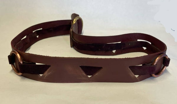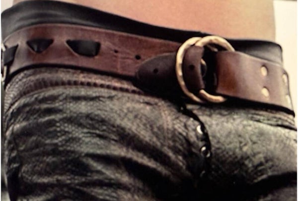The Doors played Santa Clara County Fairgrounds in 05/19/1968 Northern California Folk Rock Festival Jim Morrison was wearing the famous double ringed belt that had been modified at the festival it featured cutout triangles with suede feeding through them with two brass hoops, The brass rings was beaten and riveted and the holes was cut out for the original buckle but was never used as you can see this is I would say the nearest belt ever created this will be weathered as Jims was.This is truly a unique belt with multiple layers
