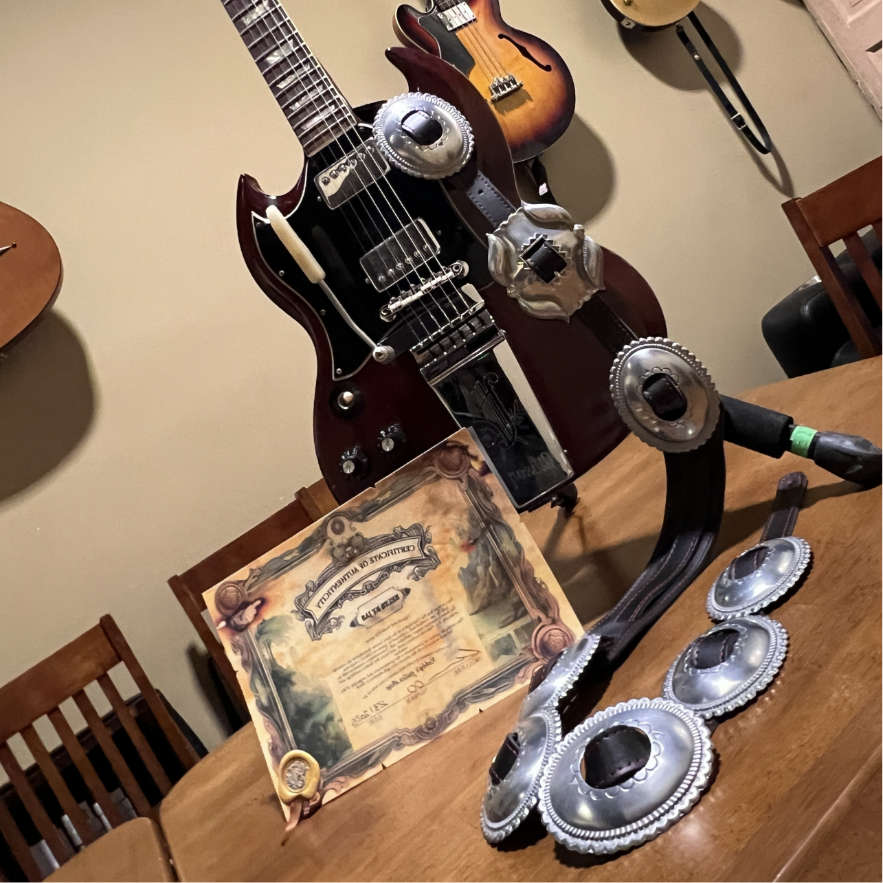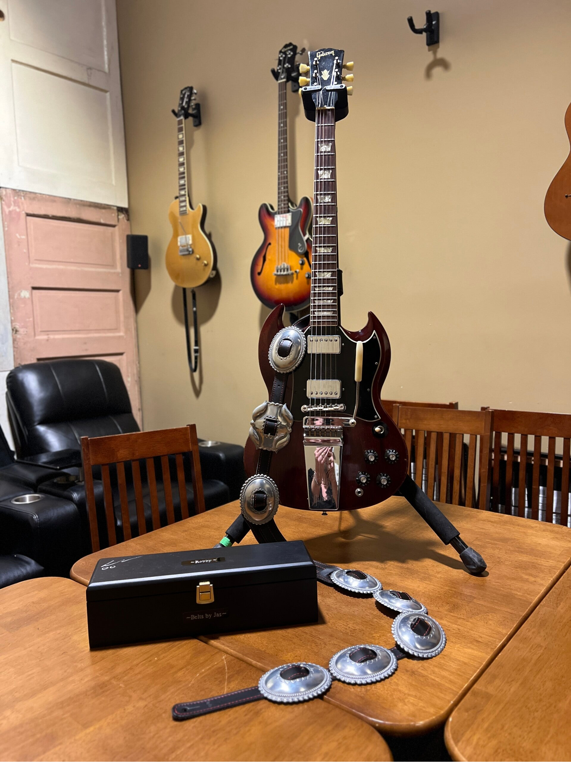 This is my light my fire/Jim Morrison guitar strap. I was very fortunate to have made the first one for Robby of the doors and now available to the general public made with Italianpremium leather with black or red insert stitching adjustable strap the Morrison conchos and buckle. In wood box un certificate of authenticity any must for any doors/ guitar player, this is definitely way a stage showstopper